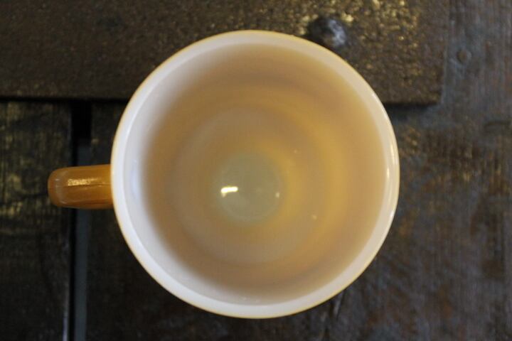全米フードサービス卸業者組合というところでしょうか、通常のトールマグと言われるフッテッドマグより2cmほど高さが低くなっています。フット部分には特徴的なリブが入ります。黄土色にこげ茶のグラフィックはコーヒーを連想させます。シェフとアメリカ地図、反対側にはGolden Brew Coffee