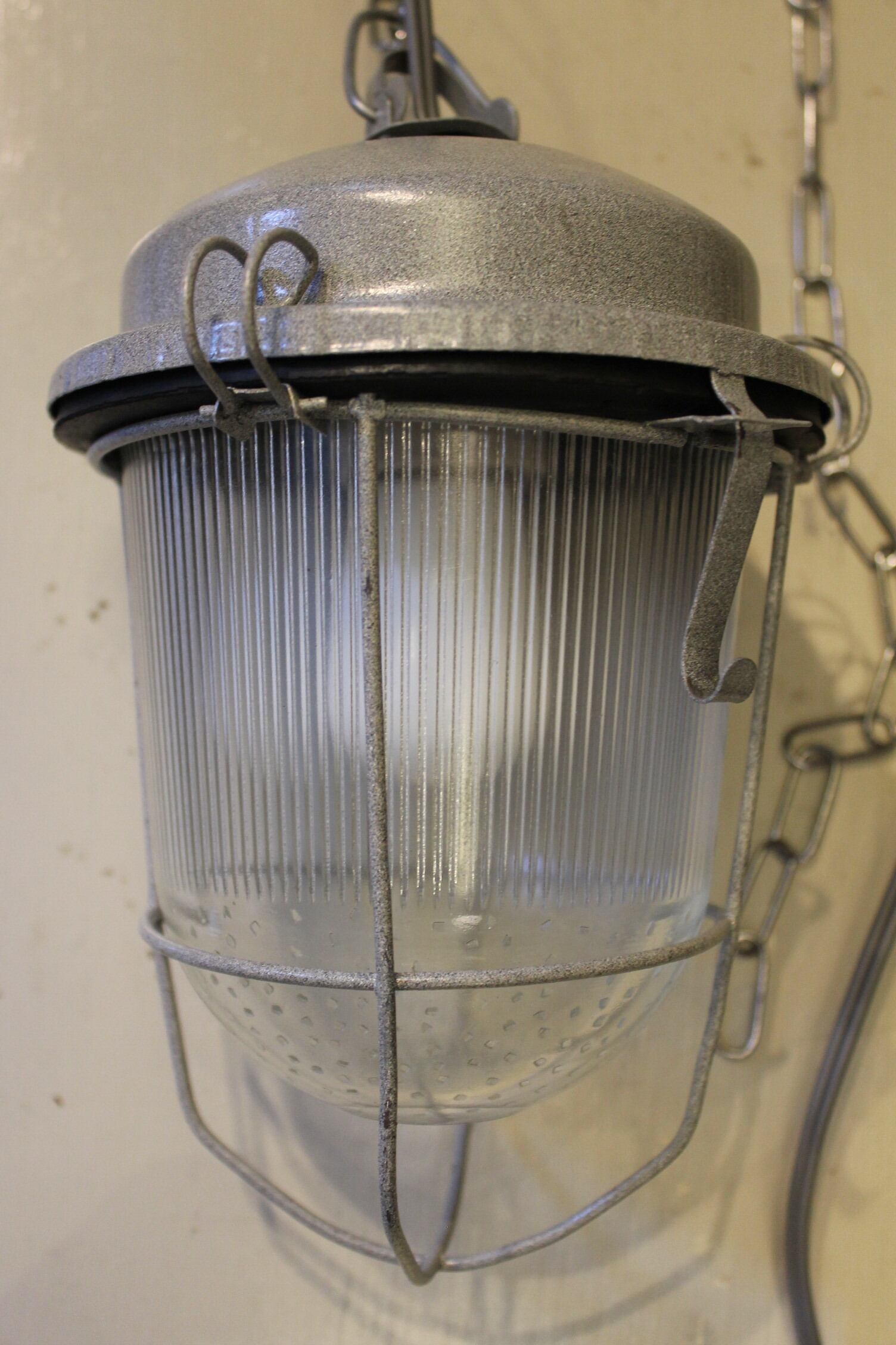 グレーのアイアンヘッドにワイヤーガードが付いた、インダストリアルを代表するデザインのペンダントライトです